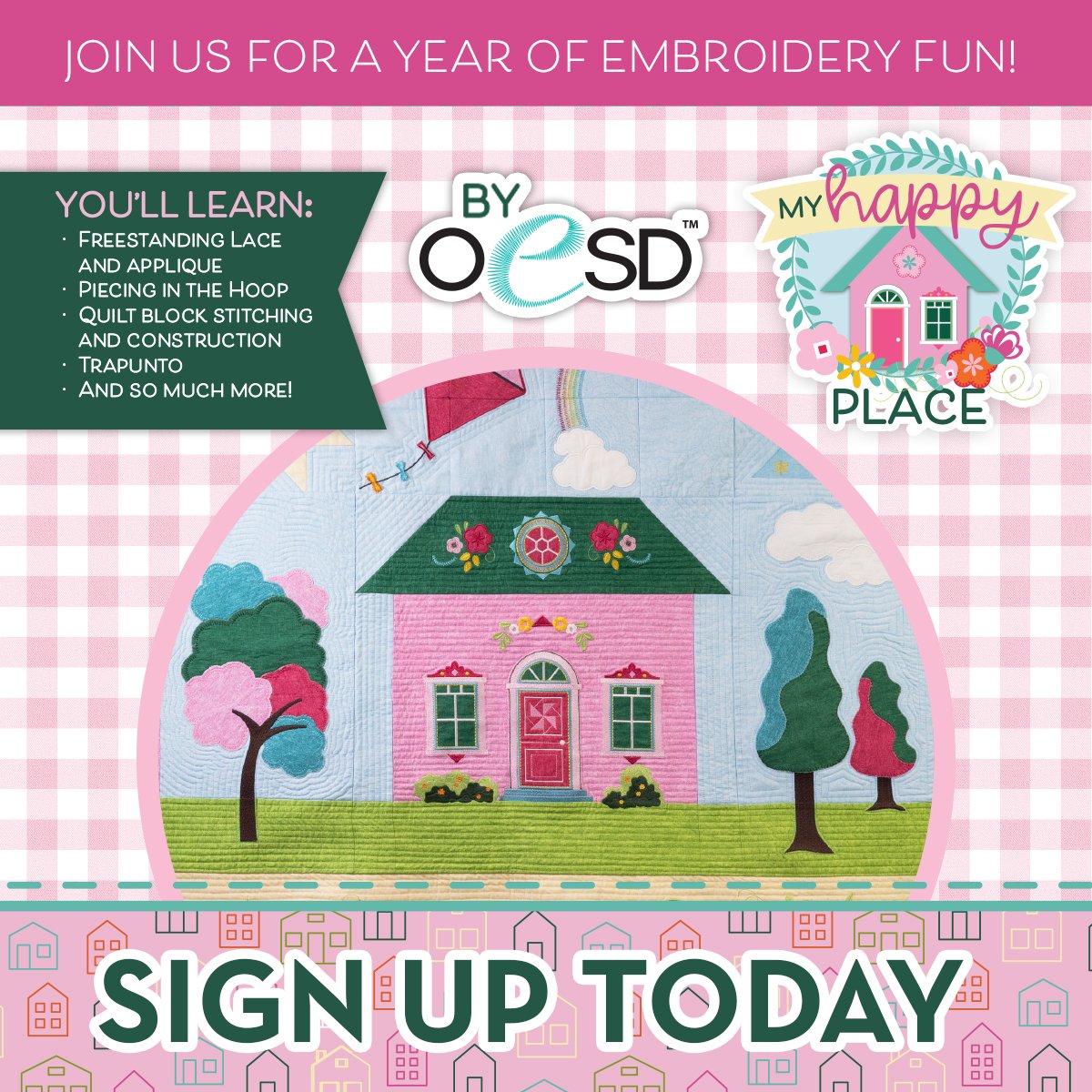 We will be making a machine embroidery sampler quilt this year. Each month you will learn a new embroidery technique. We will doing OESD's Happy Place Block of the Month.